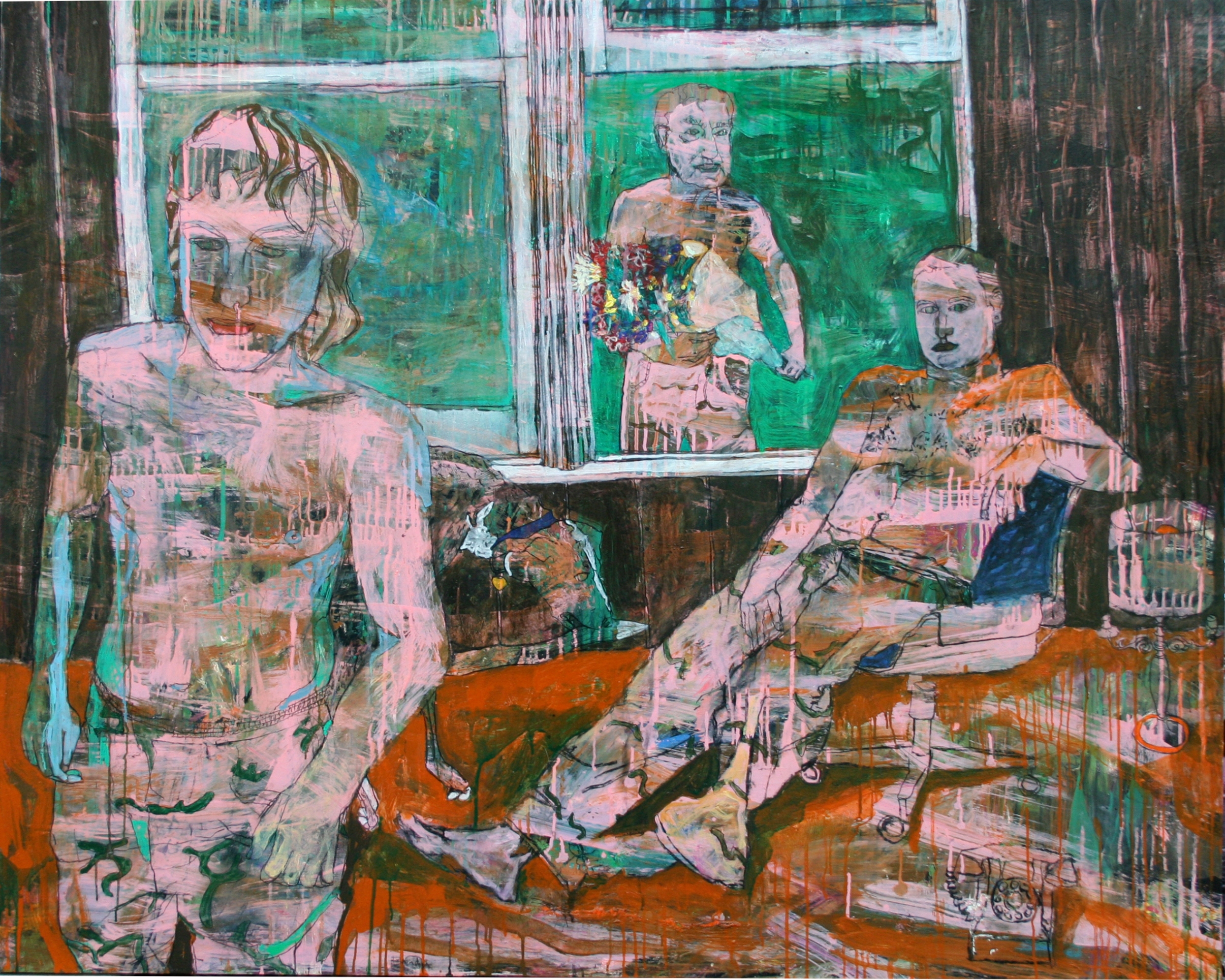 Waiting for the Call Up is a self-portrait of McGorry with his father and son. Creating this work gave McGorry an ‘eerie sense of one’s mortality’ as it was created soon after McGorry did his own generational shuffle, losing a grandfather and gaining a grandchild, thus moving from having two generations in front of him to two generations behind. . The central figure of McGorry’s father is rendered to exist in the moment, whilst the other two figures, like time, are moving on.