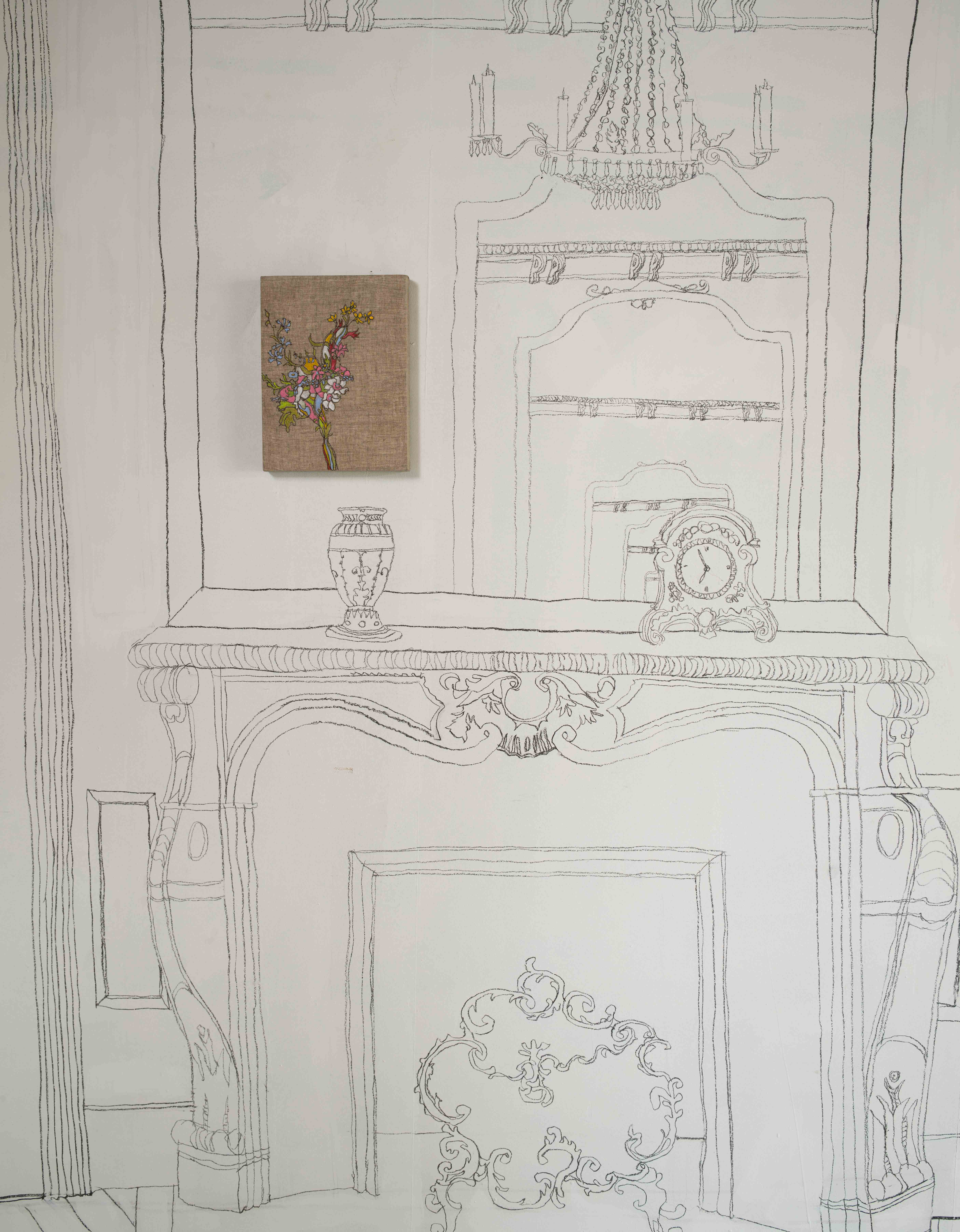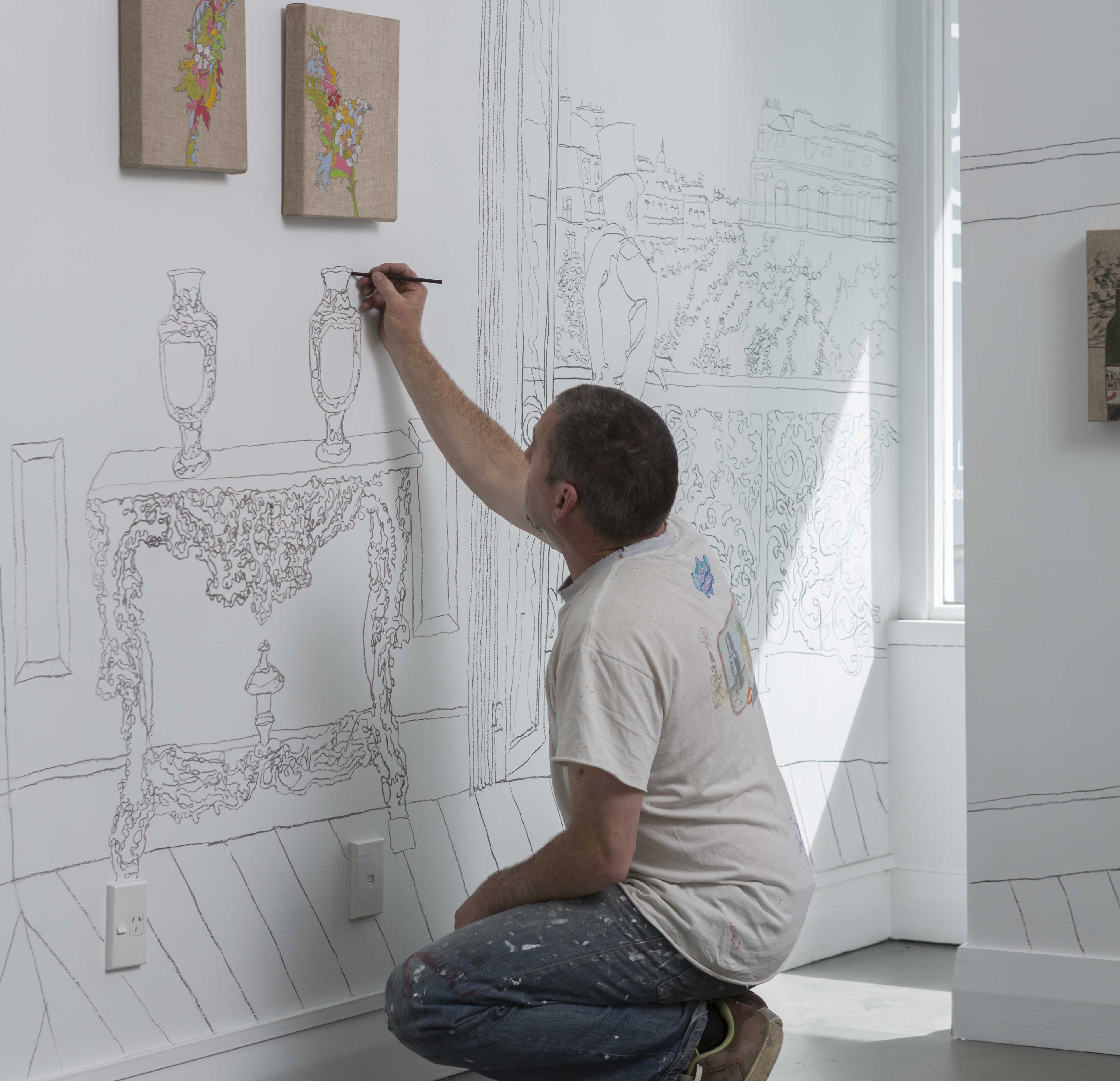 The Belle Époque Project from 2014 is an expansive mural drawn in free- hand line directly on the wall. It details a nineteenth century French interior complete with ornate furniture, vases and Parisian cityscapes through open windows. Within the mural, McGorry’s paintings hang in a strange trompe l’oeil-like situation. It’s not as if we are fooled by this as a ‘trick of the eye’, but we are at once aware of both the white-walled gallery we stand in, and the illustrated suggestion of this co-existent space.