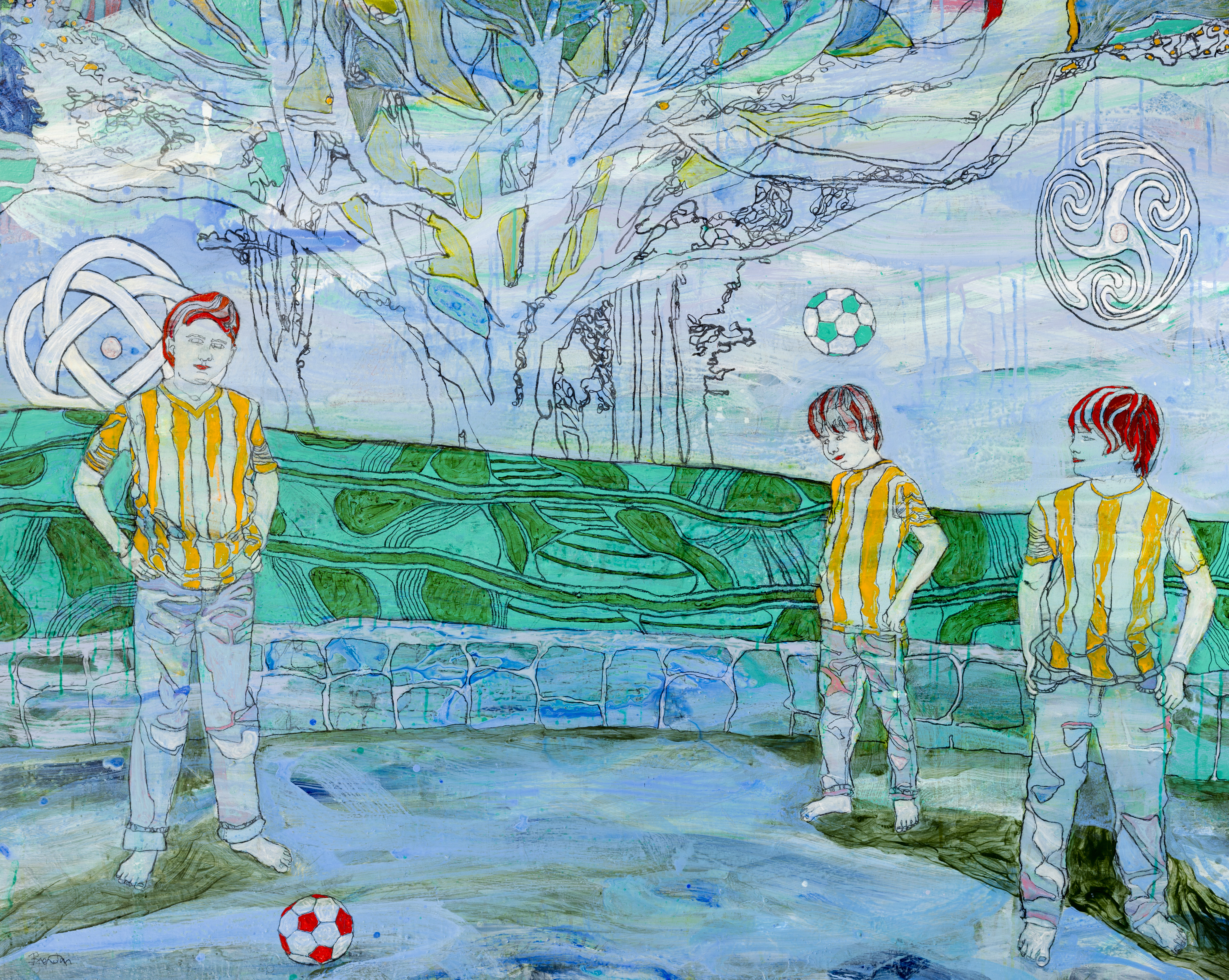 The whole ensemble is not entirely portrait painting. The situation makes a statement about families, tradition and the passing of time. This feeling is continued in Great Expectations I and II in which background waves of rhythmic colour suggest growth and movement. In other works celtic symbolic patterns are set in the sky against the moon. A stone wall in Cornwall Park stands for place and permanence.
