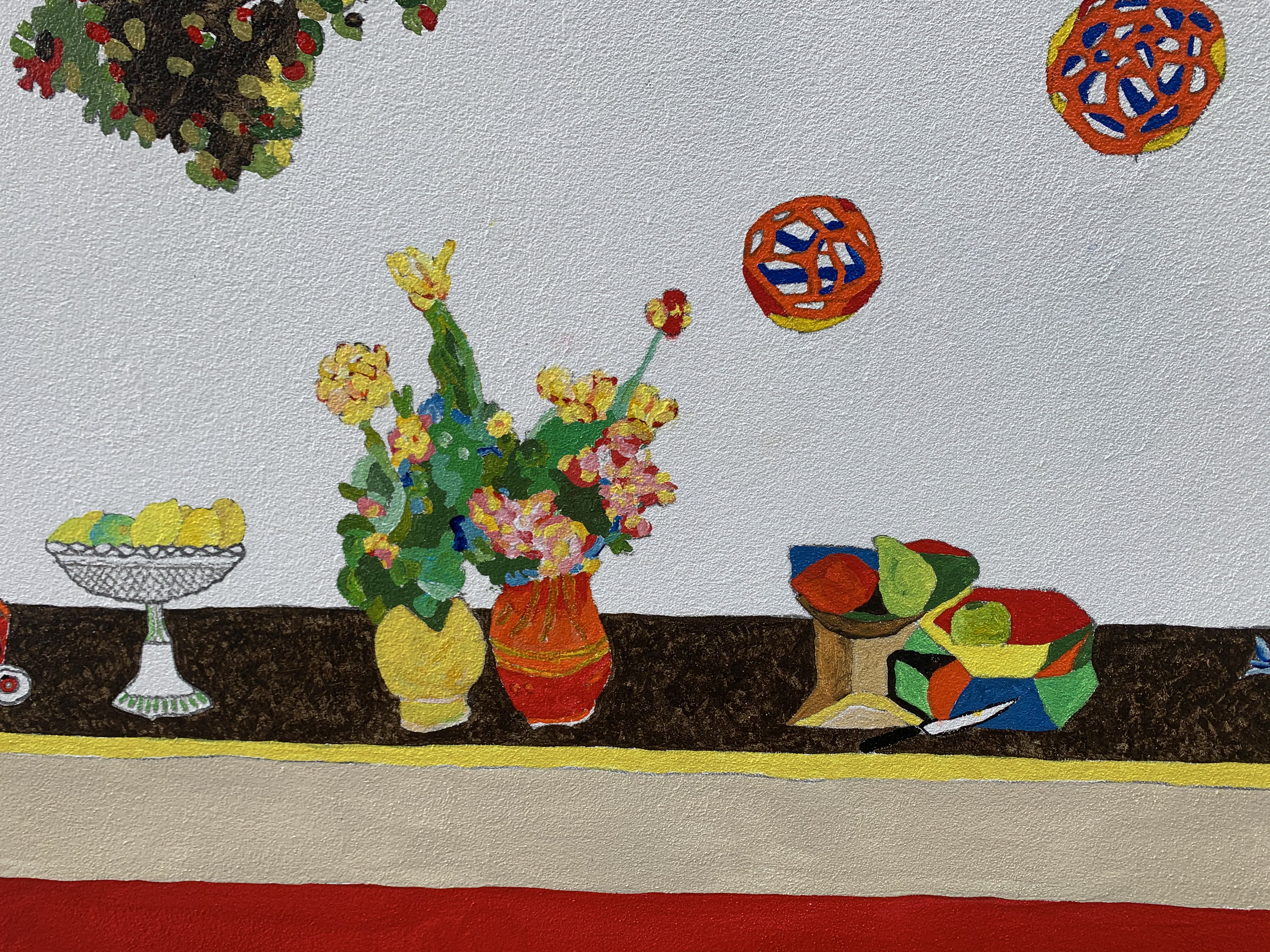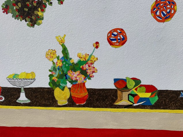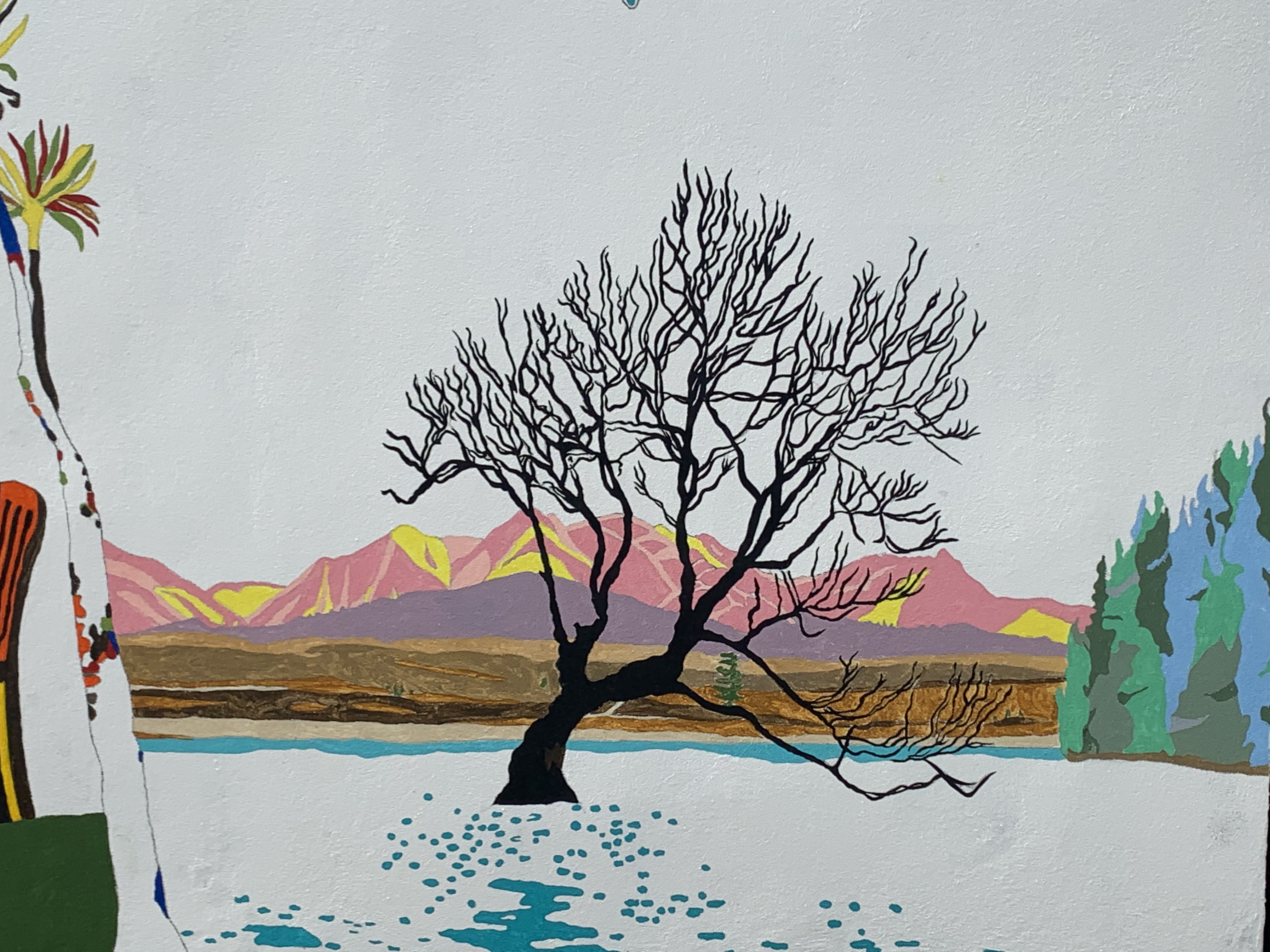 To the right over looked by media icon Kim Hill as a McCahonesque angel sits Lake Wanaka’s “That Wanaka Tree” in front of the southern Alps. This image is inspired by a 1938 Rita Angus watercolour.