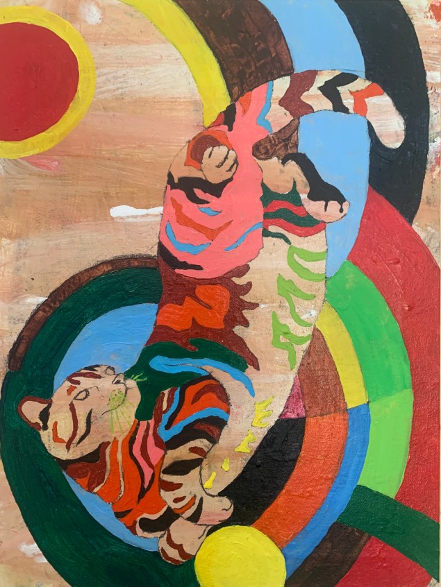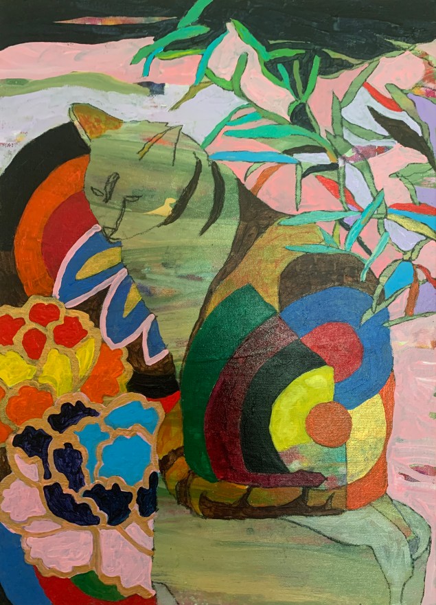 Though the artist clarifies that the merging of artistic styles and the theme of Hero run parallel to one another, the works as a result seem to be in conversation. Life is a long quiet river and The Girl with the Golden Thought are both kindred in their embodiment of resolve, as if the invisible breeze blowing through his granddaughter’s hair in the former (bolstered by lyrical Orphic forms in the background), represents the golden thought of the latter. Sunshine mirrors Portrait of the artists granddaughter in pose and positioning of the figure on the picture plane, and the cat in The Blue Cat in a surrealist turn, seems almost to have jumped out of the kimono from Portrait of the artists granddaughter, perhaps suggesting companionship and transformation.