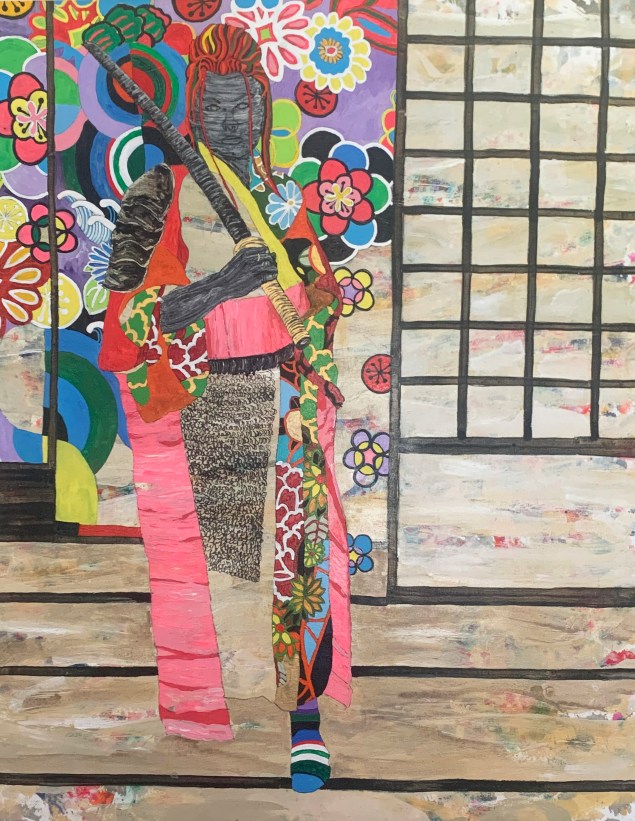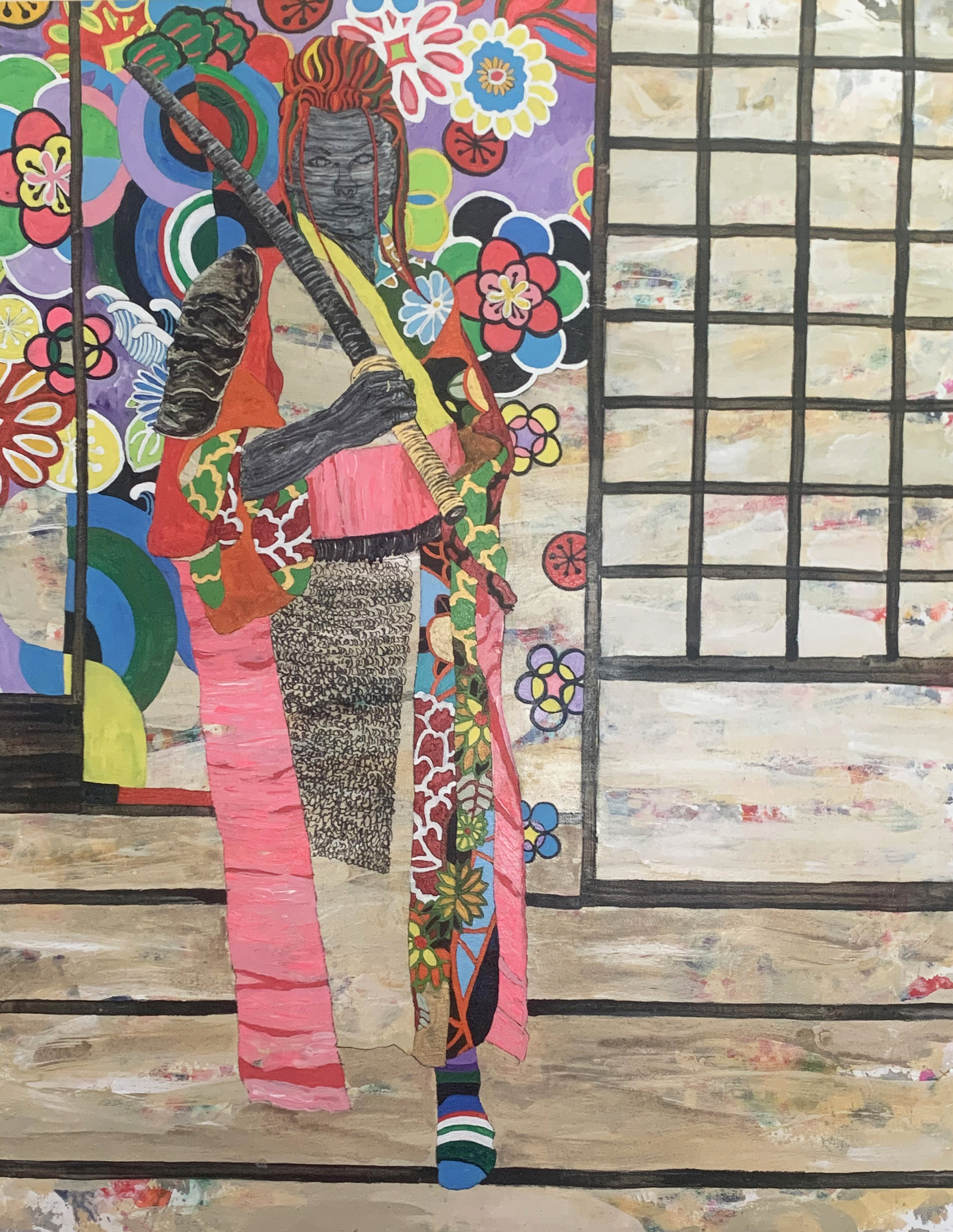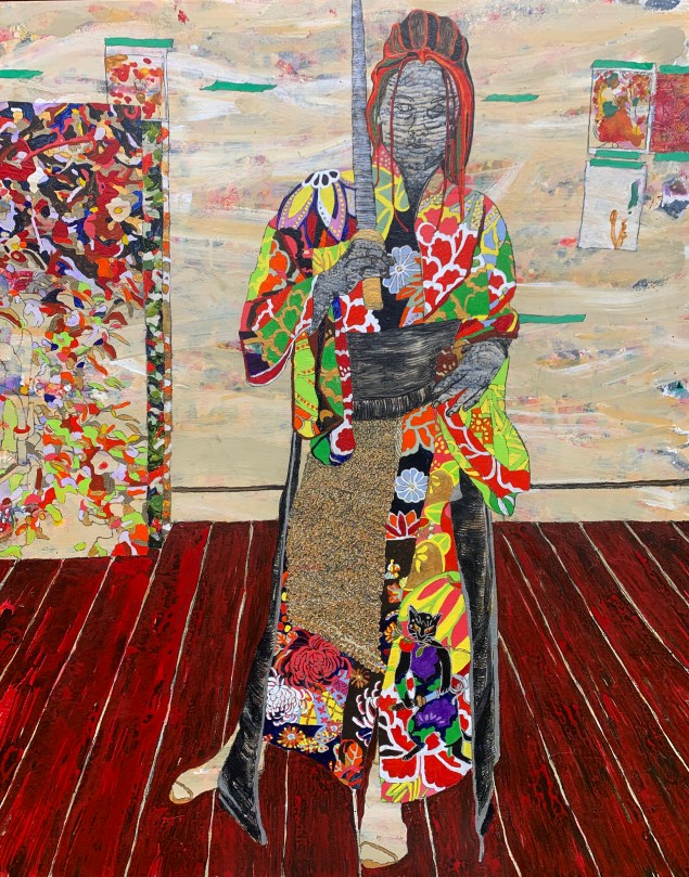 The most important conversation going on here though, is that of a young woman with her inner self and inner warrior. It is this humanistic element that distinguishes the works in Hero from traditional Japonisme style works and situates them firmly in a contemporary world. While the inclusion of Japanese objects and influences were usually decorative or artistic, here the donning of the kimono, the holding of the katana or the adornment of statement jewellery reflects a young woman’s strength in the face of adversity. McGorry’s characteristic contrasting of charcoal and colour adds further nuance to this conversation where for Aaliya, in the safety of her grandfather’s studio, the challenges and struggles she has faced have been turned into vivid patterns of resilience and growth – showing her and us that there is always hope for brighter days.