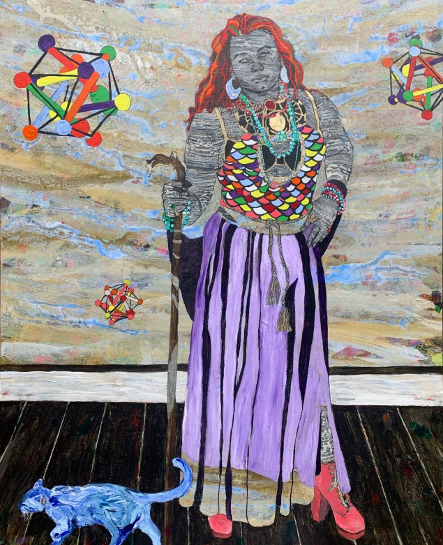 In Cleopatra, his granddaughter sits in a pose reminiscent of rulers in imperial portraits, donning royal purple and jewellery, her gaze directed at us, her power apparent. In Portrait of the artists granddaughter in the studio, she stands contrapposto, wearing a full-length kimono tied with an obi and holding a katana on her shoulder, while in The Warrior Prin- cess, Aaliya is wearing chain mail armour. In each of the works, the art historical canon surrounding portraiture is alluded to, whilst Surrealist motifs and Art Nouveau floral pat- terns surround the figure, creating dreamlike scenes. Historic and aesthetic references are juxtaposed with contemporary features such as thick leather boots, striped socks or a cat idly walking by.